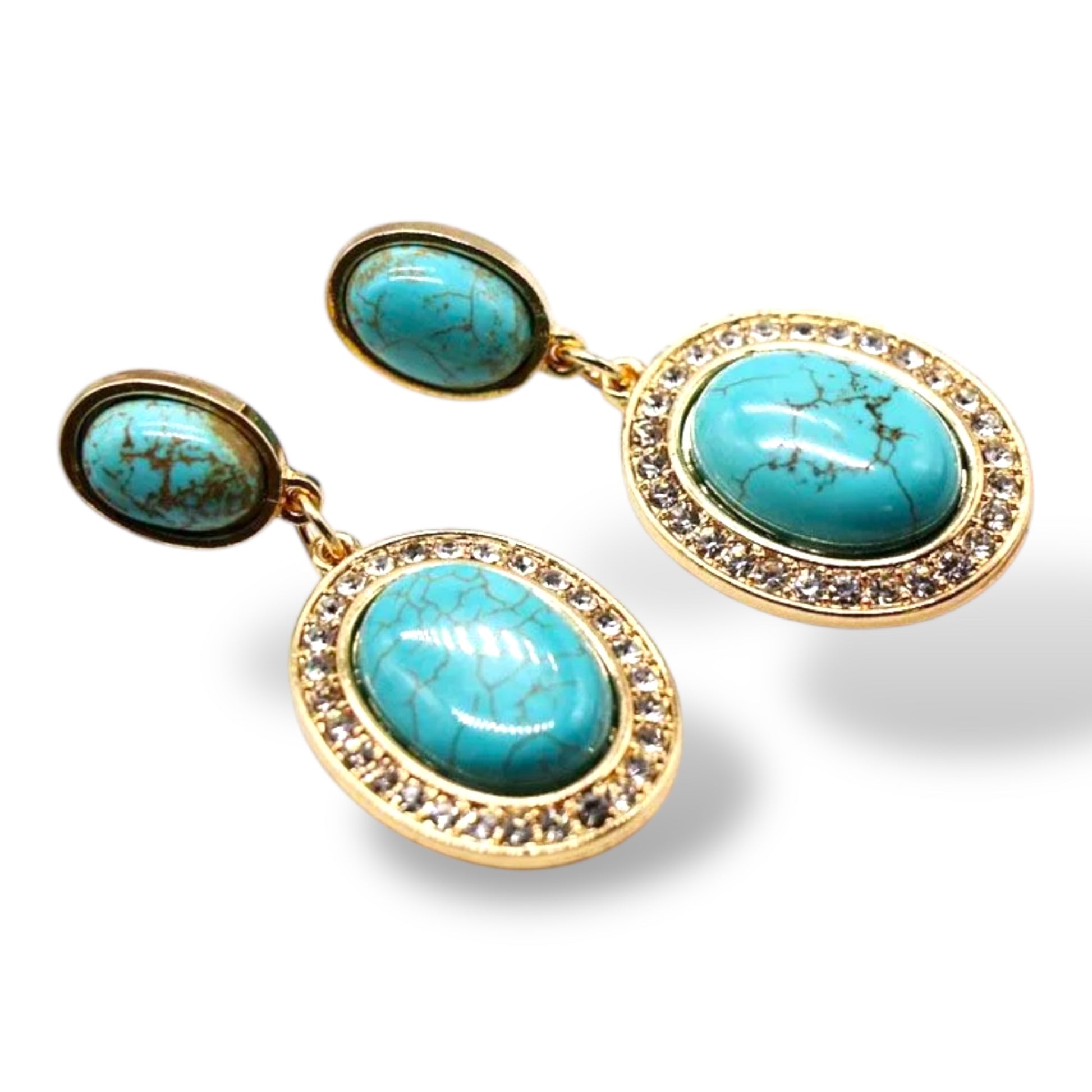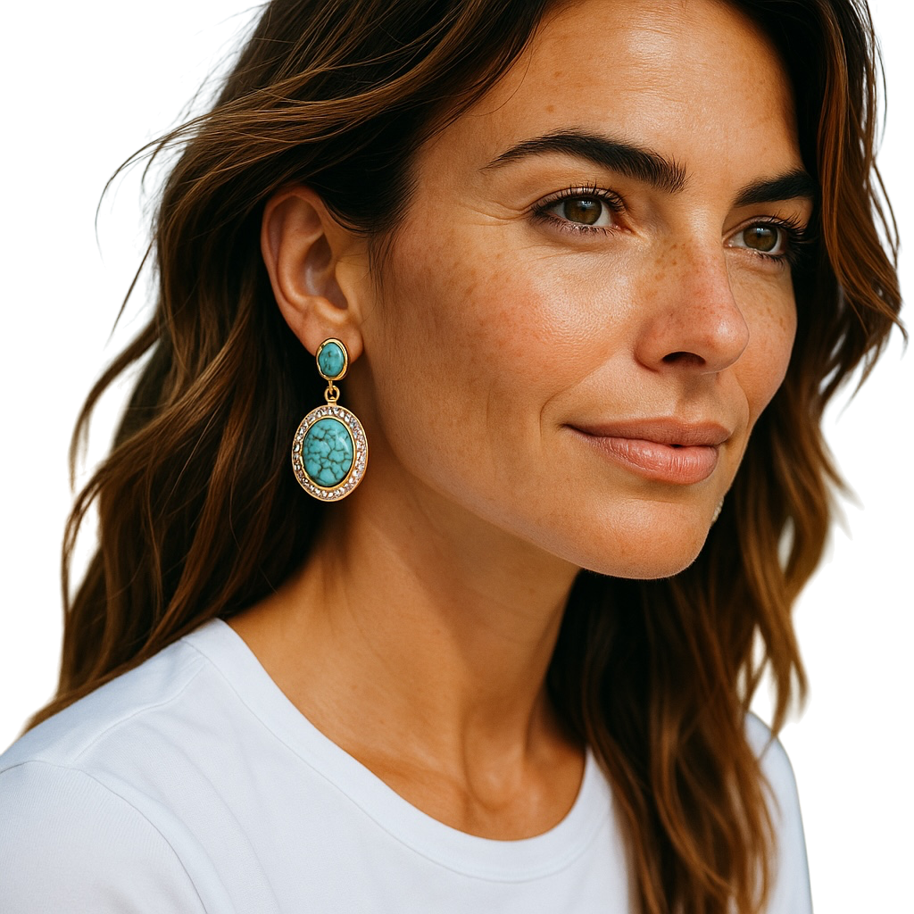 Our Astra turquoise drop statement earrings are meticulously crafted to add a touch of elegance and sophistication to any outfit. Made with high-quality materials and featuring stunning designs, these earrings are a must-have accessory for fashion-forward individuals. With their exquisite gold-plated and stone finish, they exude a sense of luxury and opulence, making them perfect for special occasions or everyday wear.