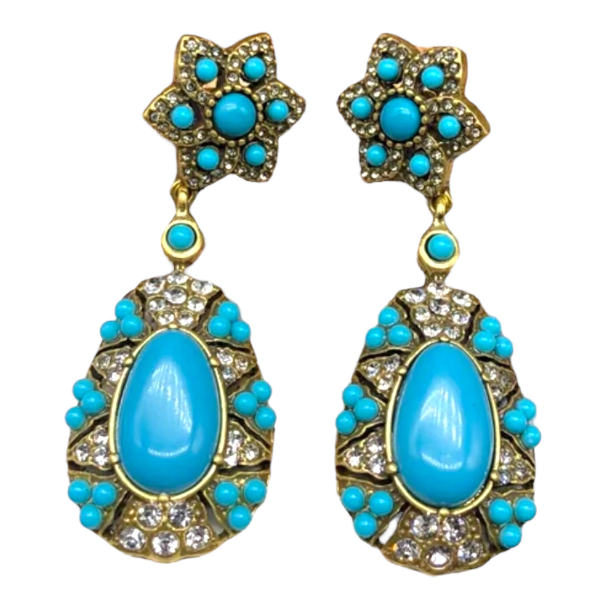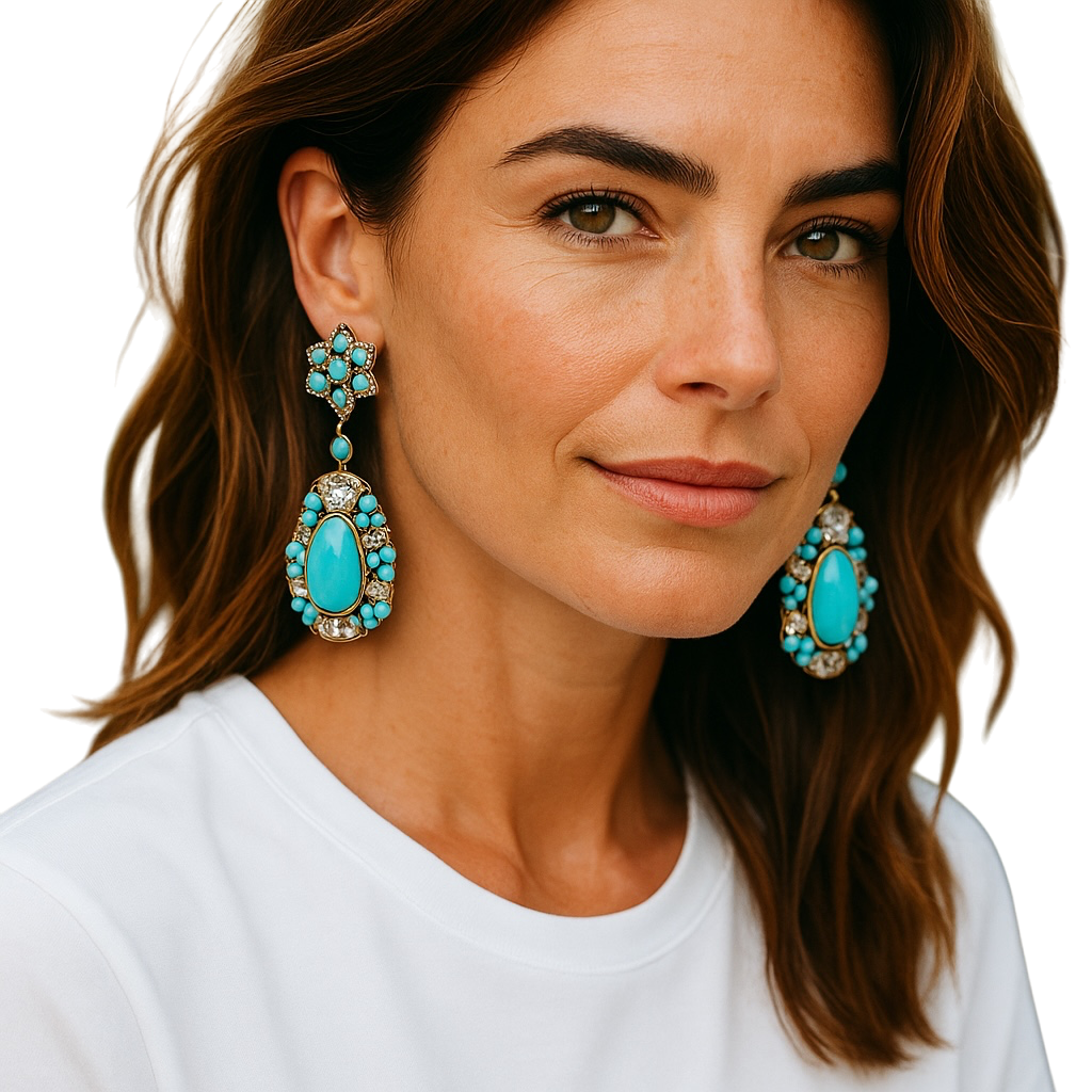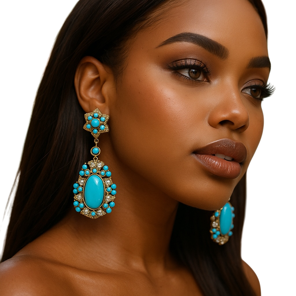 Our Nova turquoise drop statement earrings are meticulously crafted to add a touch of elegance and sophistication to any outfit. Made with high-quality materials and featuring stunning designs, these earrings are a must-have accessory for fashion-forward individuals. With their exquisite gold-plated and stone finish, they exude a sense of luxury and opulence, making them perfect for special occasions or everyday wear.